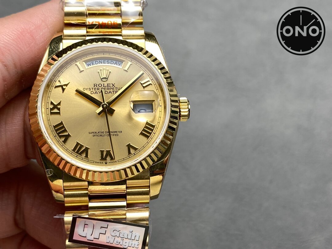 Home Rolex Day Date ONO QF Rolex Day-Date 128238 Asian 2836 36mm Champagn Dial 18k Yellow Gold Case Gain Weight